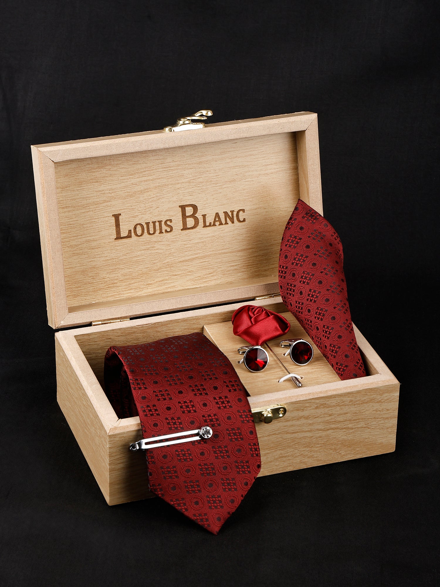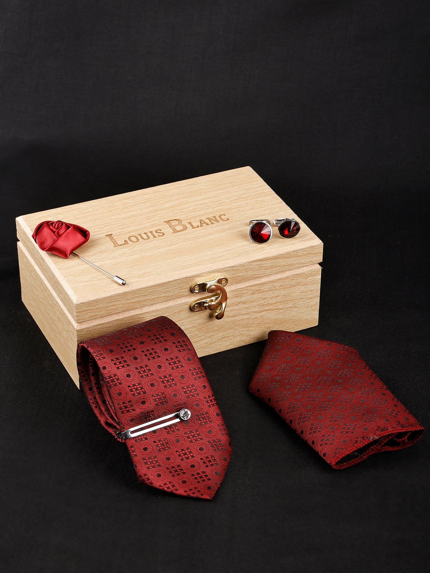 Denim Mehroon Italian Necktie Set With Pocket Square Silver Tie Pin, Cufflinks & Brooch