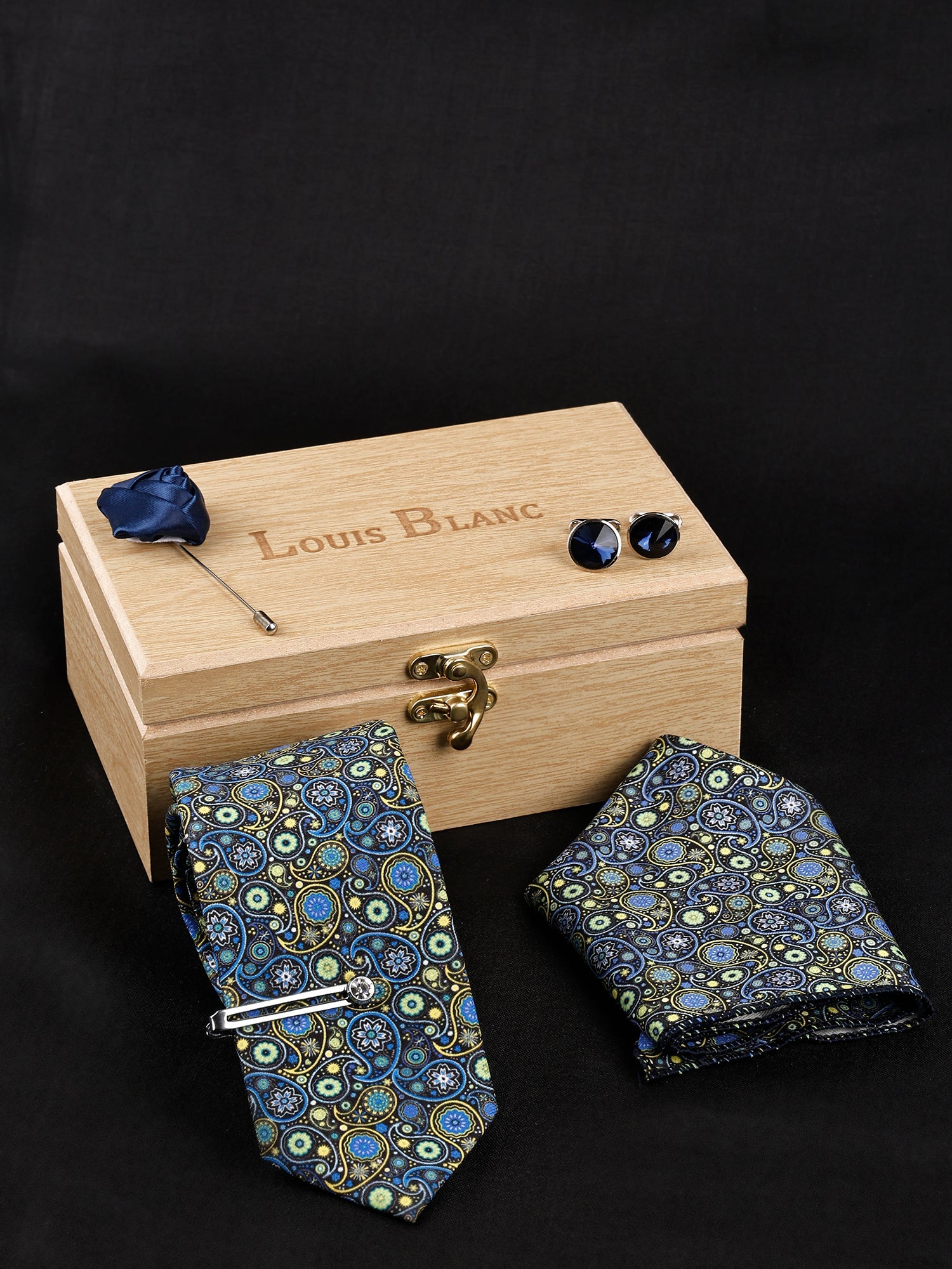 Dodger Navy Luxury Italian Silk Necktie Set With Pocket Square Silver Tie pin, Cufflinks & Brooch