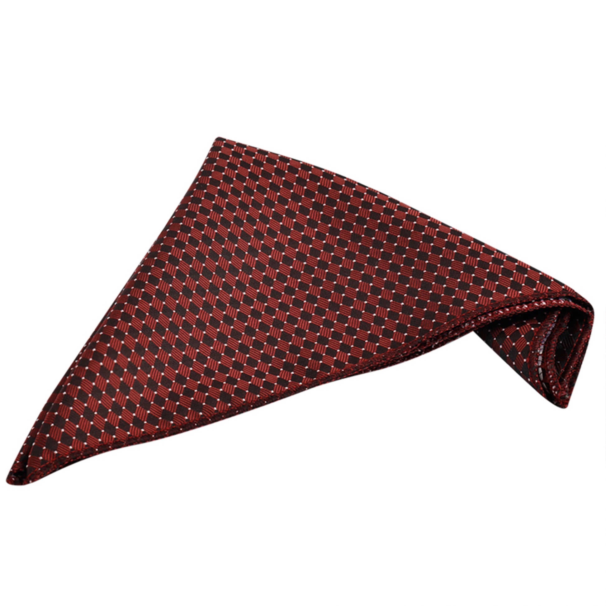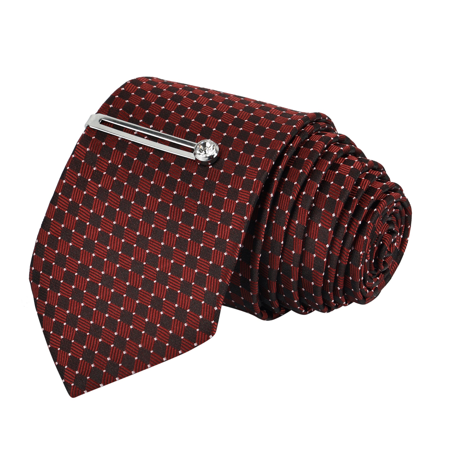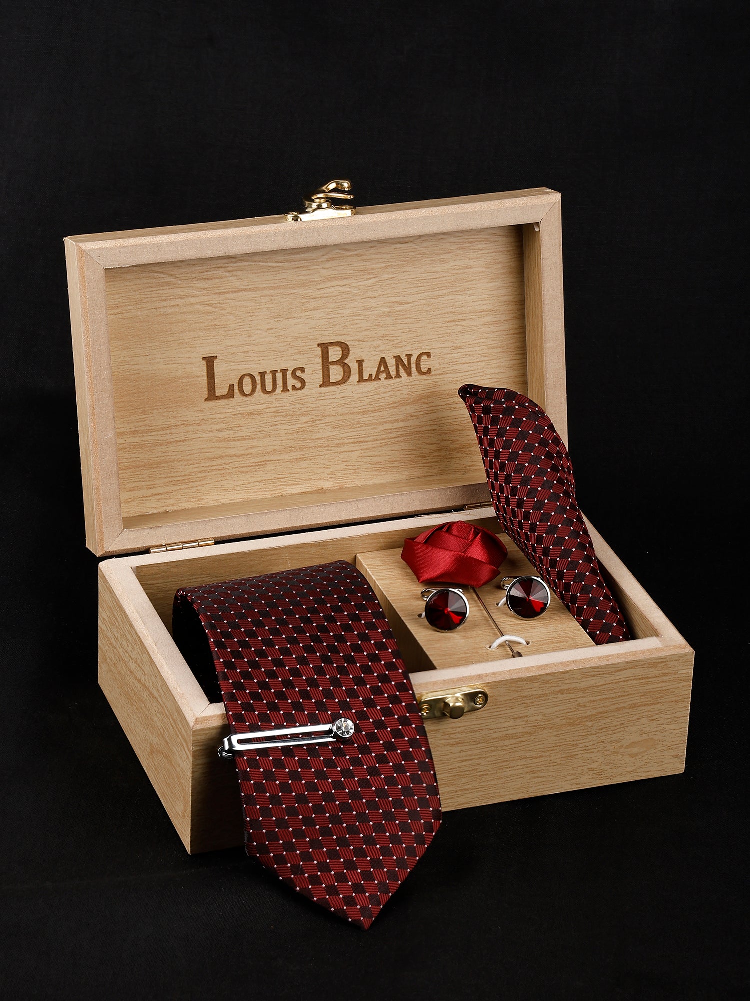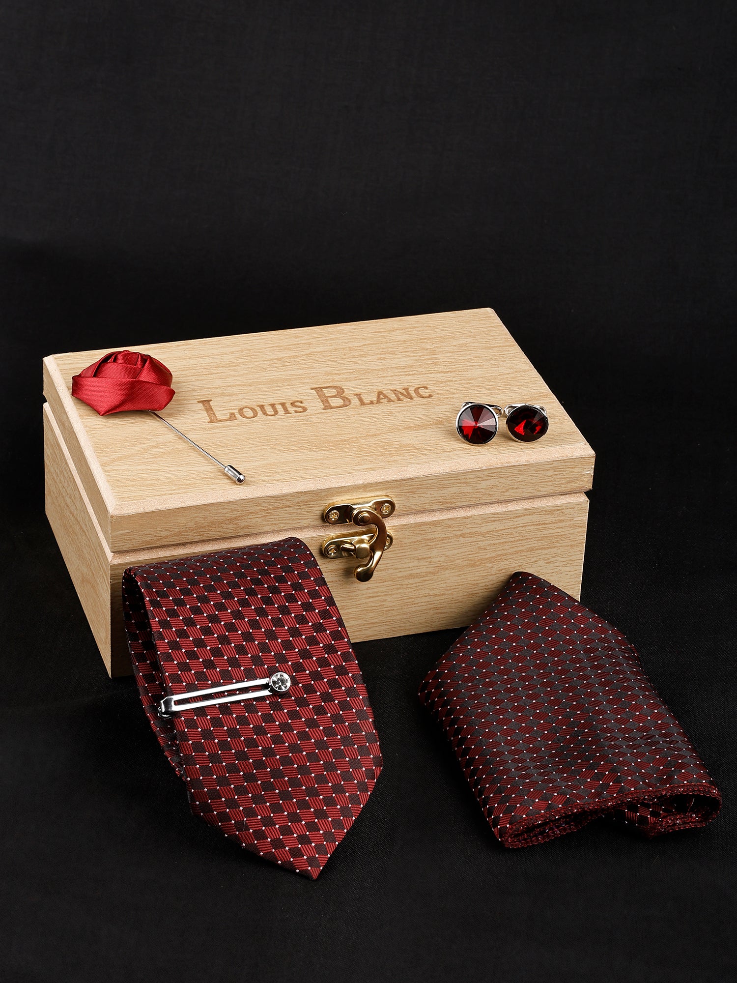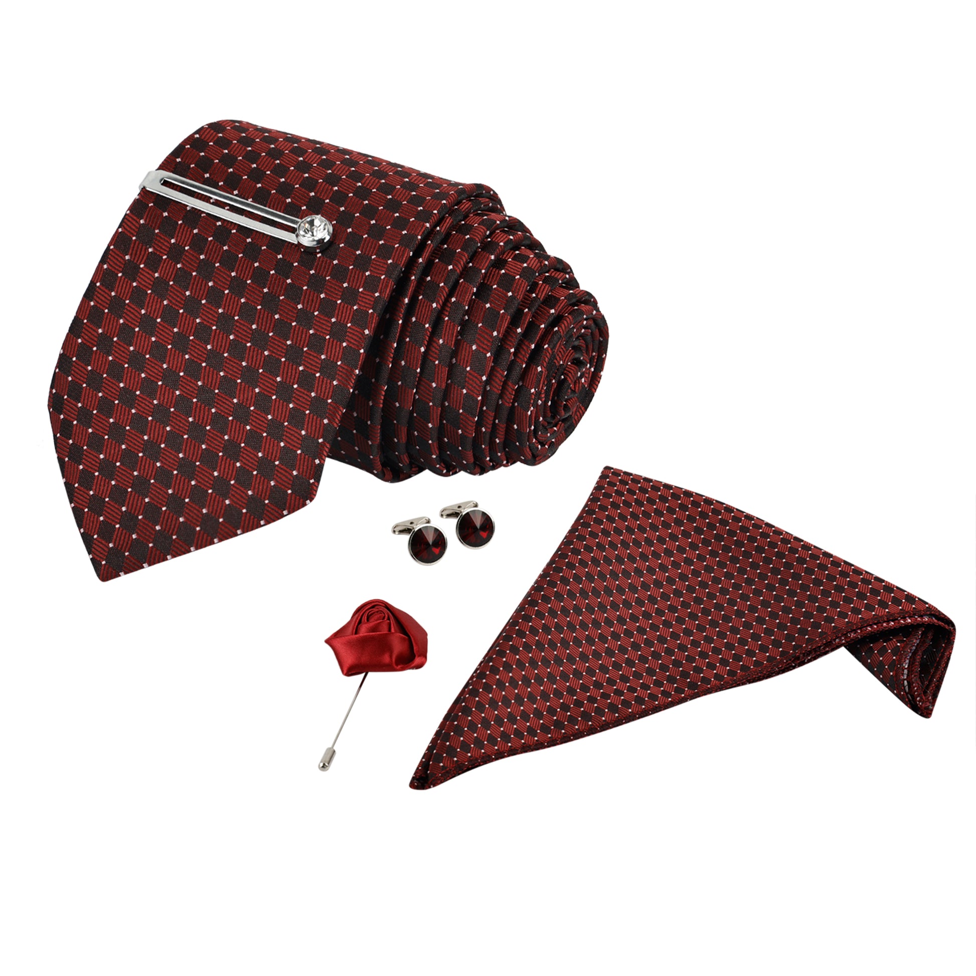 Geometric maroon Italian Necktie Set With Pocket Square Silver Tie Pin, Cufflinks & Brooch