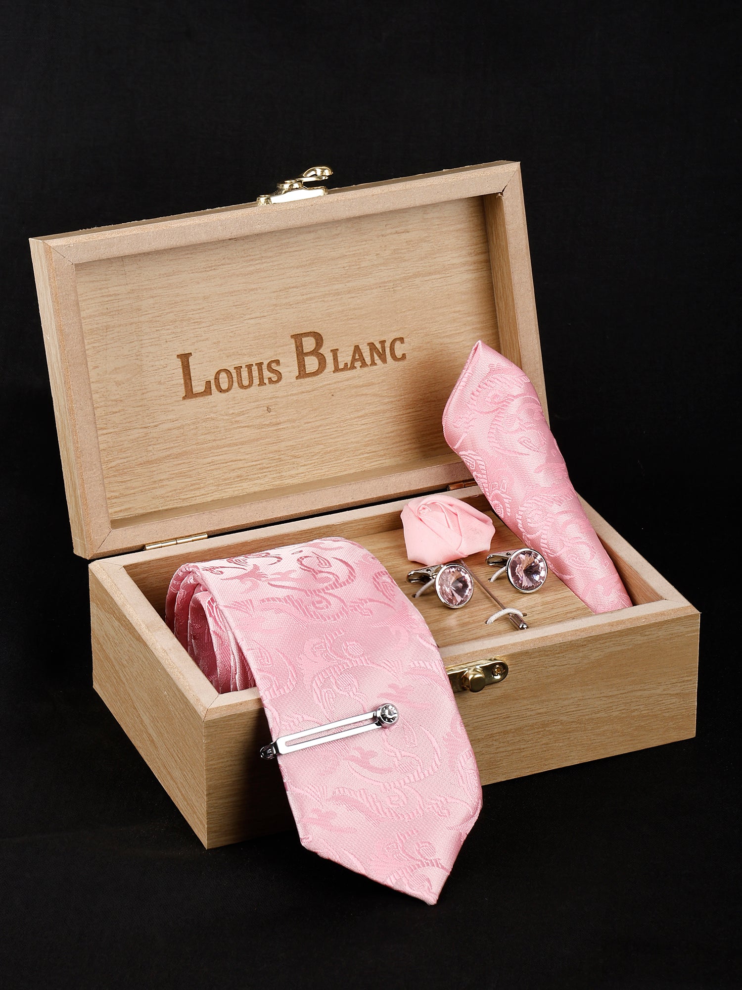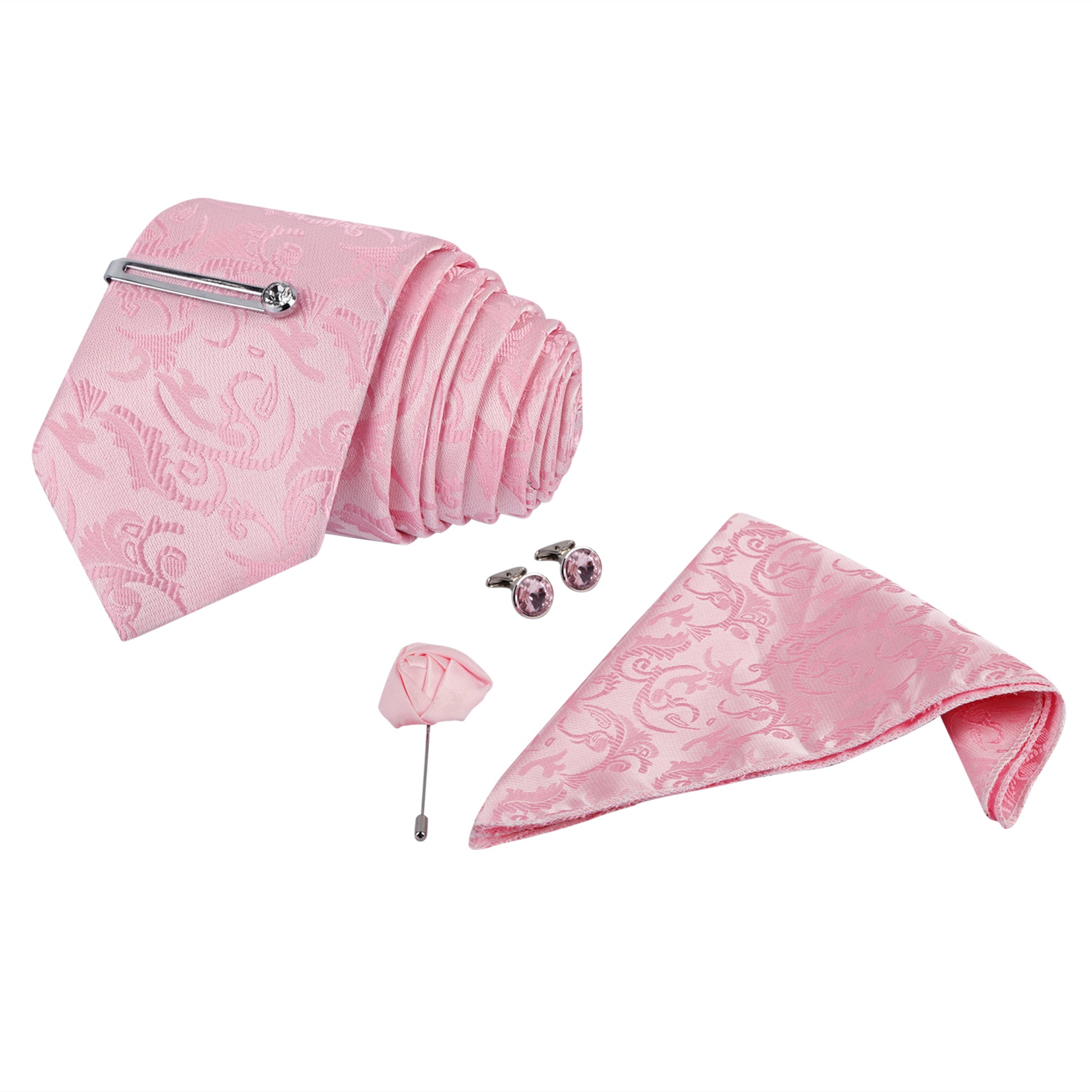 Kari baby pink Italian Necktie Set With Pocket Square Silver Tie Pin, Cufflinks & Brooch