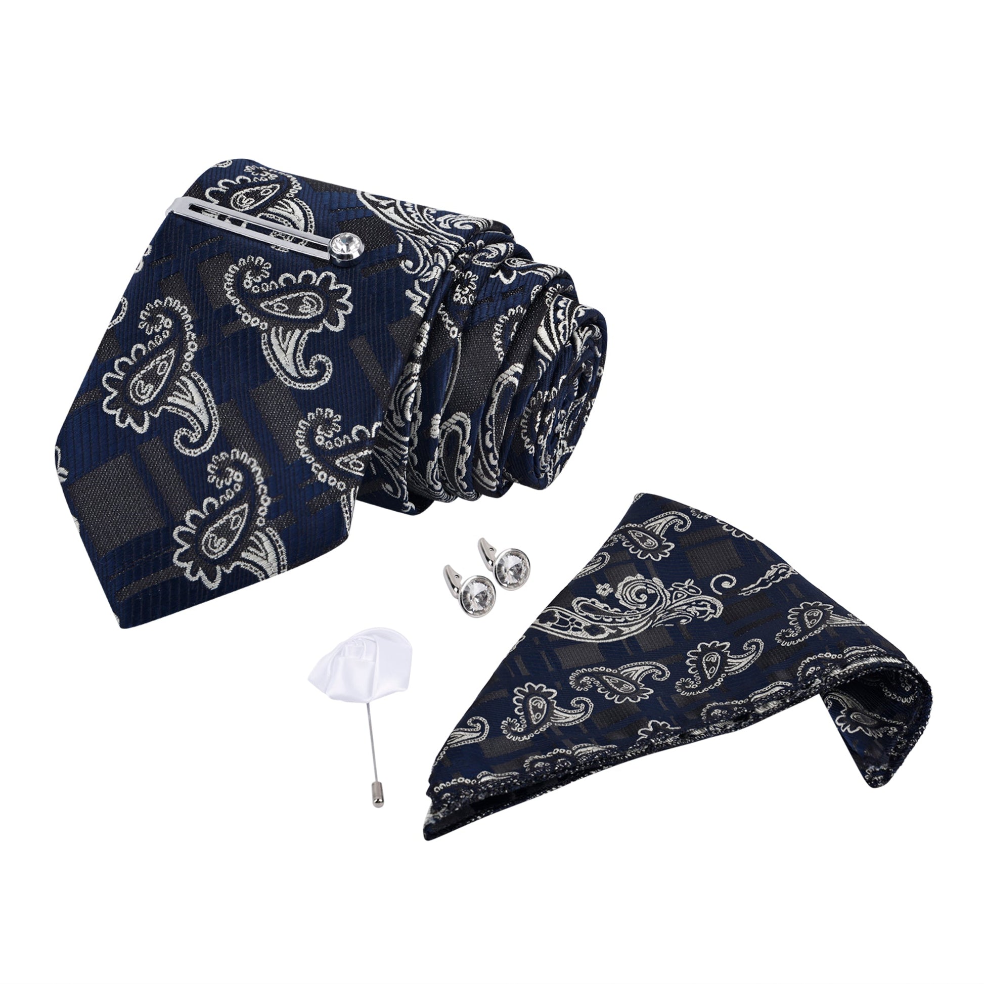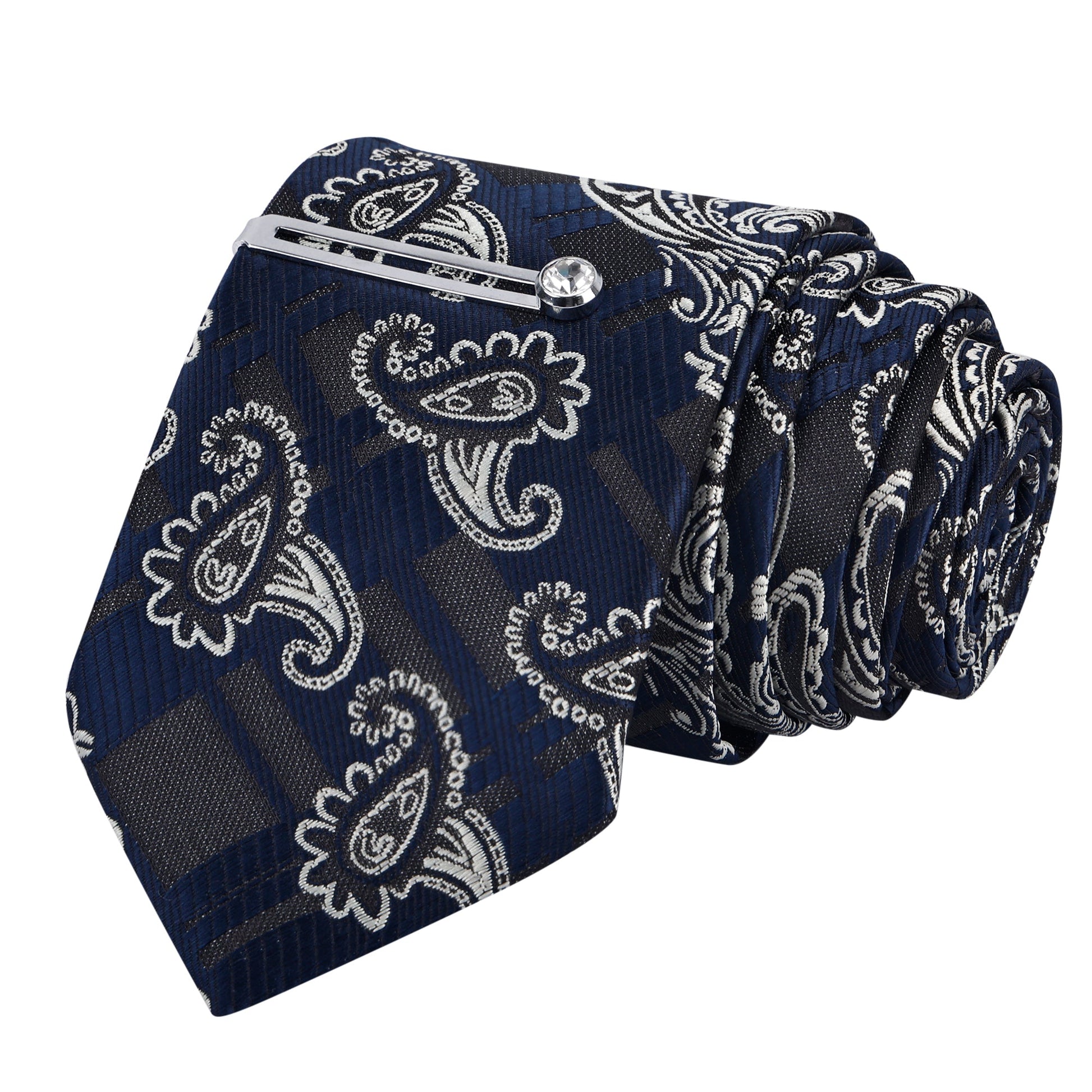- Package includes: Necktie with Pocket Square, Chrome Tiepin, and Signature Brand Box