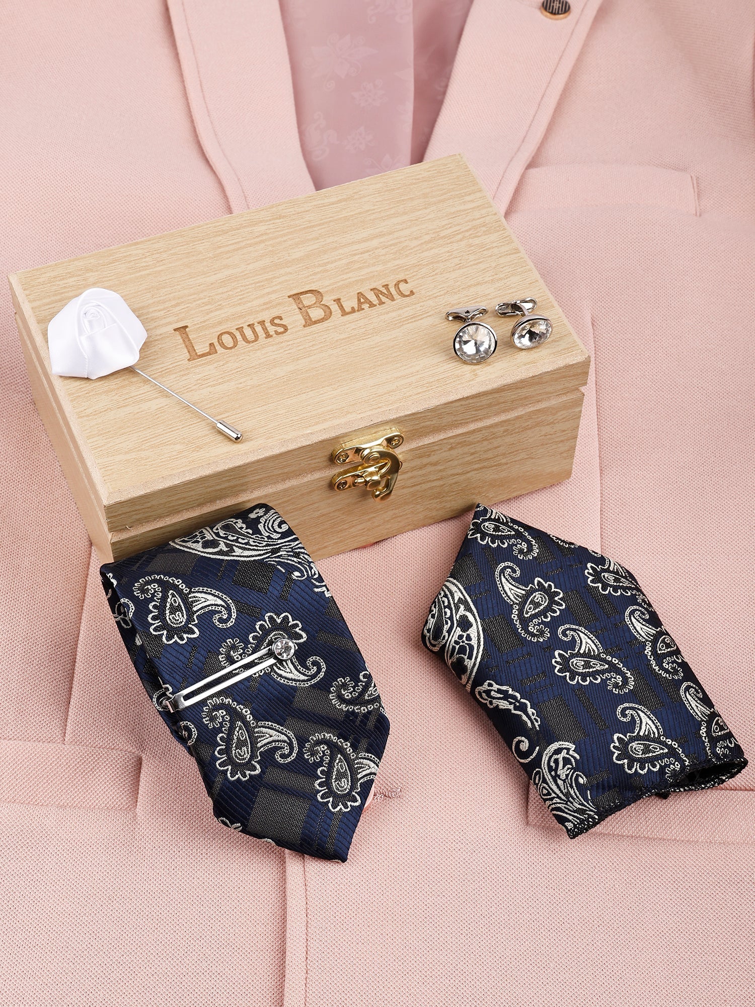 Lilac Navy Italian Necktie Set With Pocket Square Silver Tie Pin, Cufflinks & Brooch