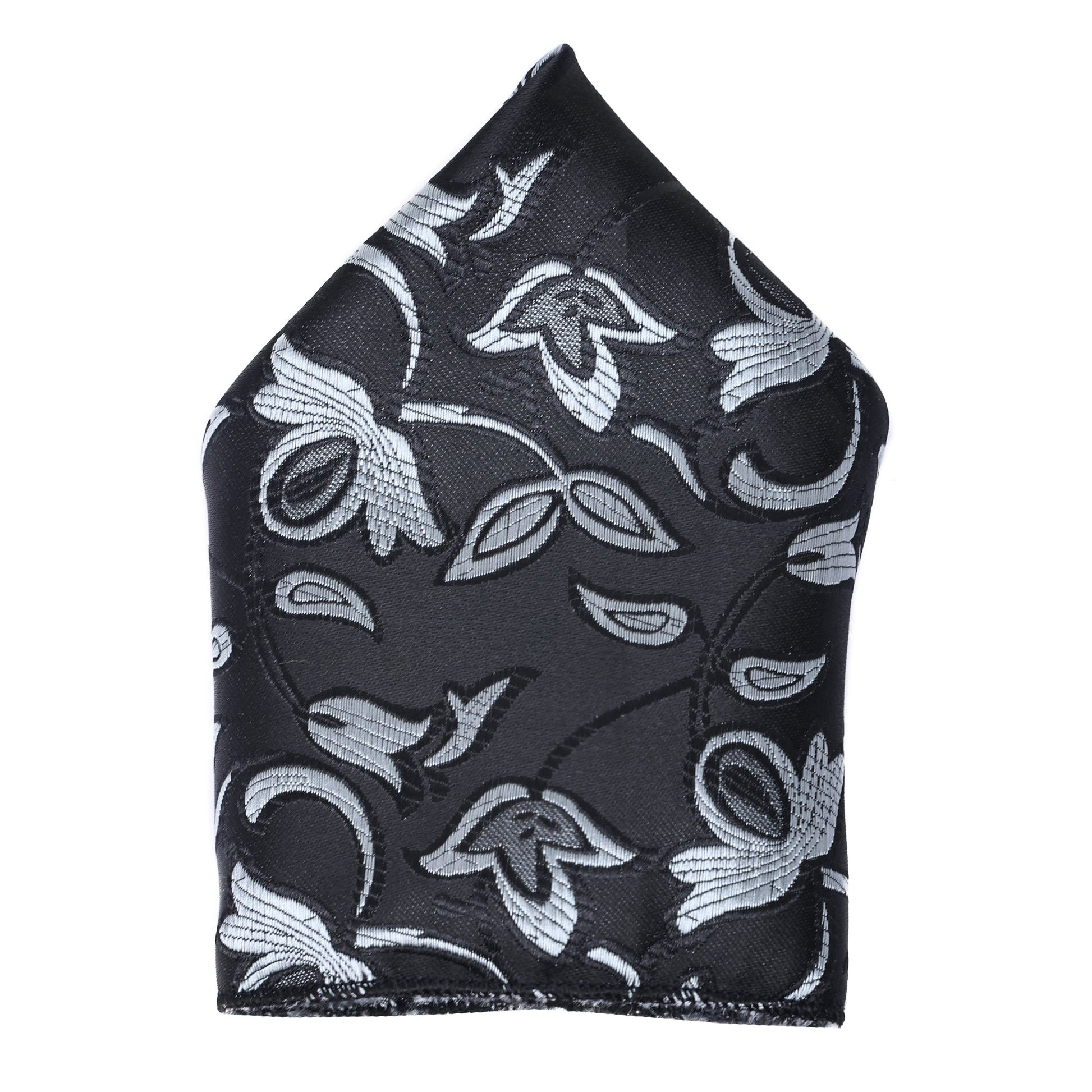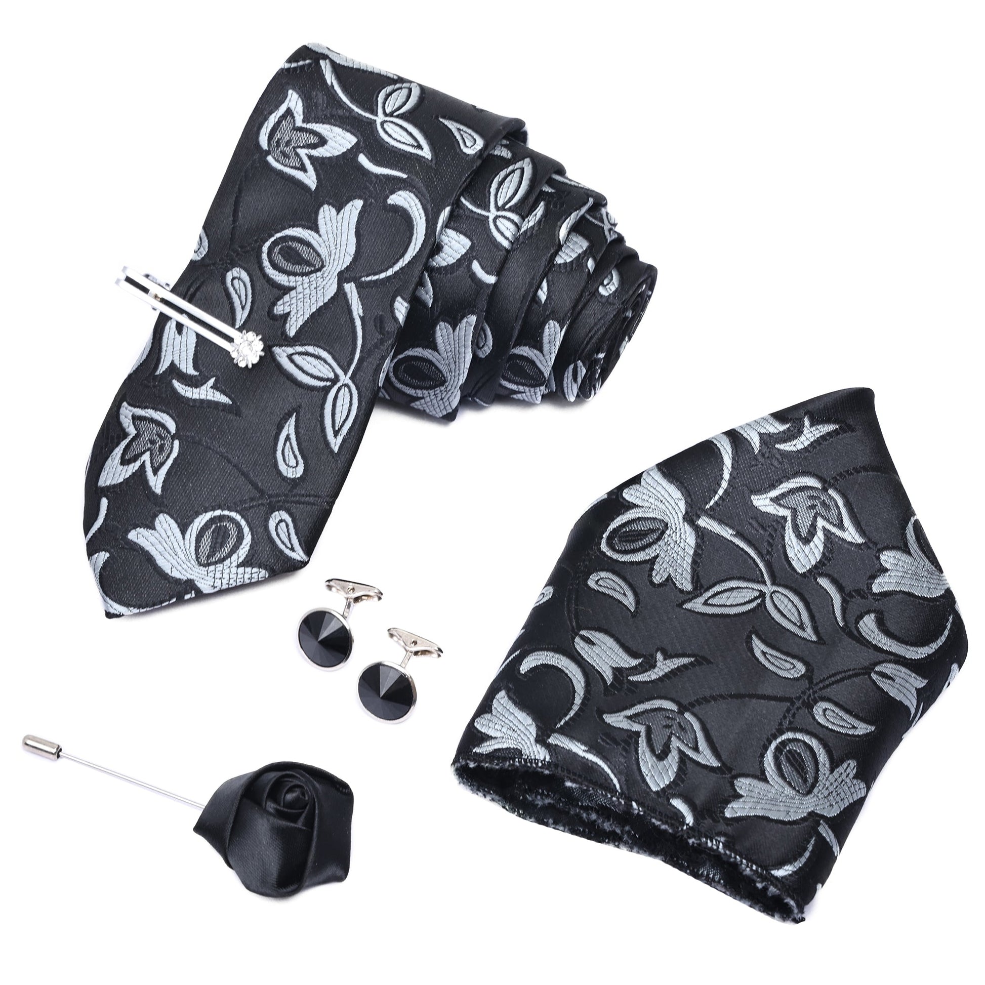 Sable Black Italian Silk Neckties Set Pocket Square Silver Tiepin Cufflinks & Brooch